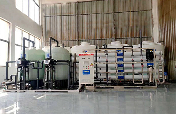 原水->多介质过滤器->活性炭过滤器->软化水器->中间水箱->低压泵->精密过滤器->一级反渗透->PH调节->混合器->二级反渗透(反渗透膜表面带正电荷)->纯水箱->纯水泵->微孔过滤器->用水点